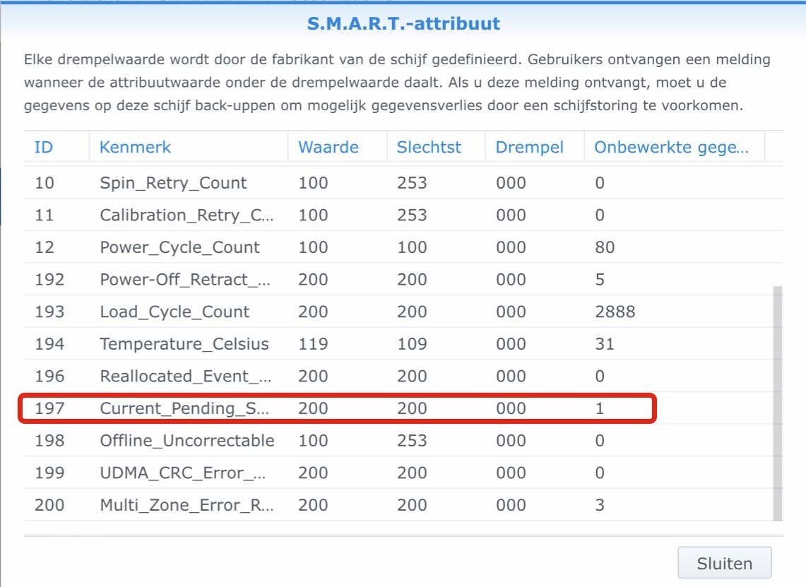 Wil je weten wat precies, klik dan weer op de tab HDD/SSD, selecteer de zieke schijf en klik op Integriteitsinfo. Je kunt eventueel nog een uitgebreide S.M.A.R.T.-test uit laten voeren, mogelijk kom je dan nog meer gekkigheden op het spoor. Zo’n test kost wel enkele uren, maar dan heb je ook wat. Scroll helemaal naar beneden en klik op Details. Je ziet nu de tabel met meetgegevens. Voor een leek niet echt chocola, maar in ons voorbeeld zien we inderdaad een pending sector. Daar is een keer iets mis gegaan met een lees- of schrijfactie. En dat probleem zien we terug in de foutmelding van de nas. Maak je er verder niet druk over: de gekke sector is reden genoeg om de schijf te vervangen, wat ons betreft. Zeker na jaren trouwe dienst.