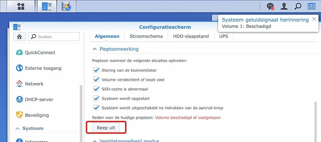 Uiteraard is het zaak dat je de juiste schijf verwijdert. Check en dubbelcheck daarvoor in de foutmelding over welke schijf het gaat. Bouw deze uit en bouw de nieuwe vervangschijf weer in. De nas kan weer aan. Schrik niet van de alarmpieper en oranje status-LED. Ja, natuurlijk is er iets mis met je RAID-volume, want er is een complete schijf qua inhoud verdwenen. Om de RAID-eenheid weer netjes compleet te maken klik je in het al automatisch voor je geopende paneel van het Configuratiescherm eerst op de knop Beep uit. Rust in de tent!