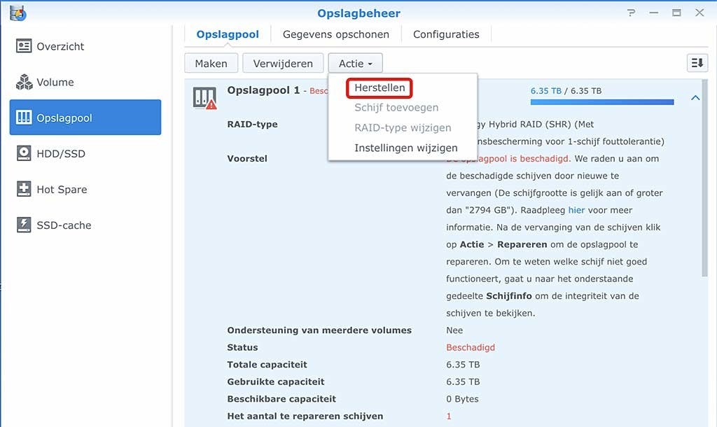 Start nu weer de app Opslagbeheer, alwaar je onder Overzicht alvast de melding Beschadigd ziet staan. Klik links in de kolom op Opslagpool en dan op Actie en Herstellen. Vervolgens kun je met een gerust hart op één oor gaan liggen, het herstellen kost flink wat tijd. Mooi klusje dus om in de nachtelijke uren uit te laten voeren. Dat het lang duurt is niet zo heel vreemd: alle gegevens van de achtergebleven RAID-schijf (of een deel ervan als je bijvoorbeeld 4 schijven hebt ingebouwd) worden gekopieerd naar de nieuw ingebouwde harddisk. Dat kan om vele Terabytes aan data gaan. Je kunt de nas tijdens de herstelactie gewoon gebruiken, maar het is aan te raden om het apparaat niet te veel te belasten om problemen (en nóg langer wachten...) te voorkomen. Is de herstelactie klaar, dan kun je – tenminste wat de nieuwe harddisk betreft – als het een beetje meezit weer een paar jaar vooruit!