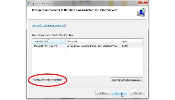 Allereerst, gebruik System Restore. Om dat programma in Windows 7 te openen, klik op Start, typ system restore en selecteer System Restore. In Windows 8, ga naar de Search charm, typ restore point en selecteer Create a restore point. In het dialoogvenster dat verschijnt, klik op de knop System Restore.