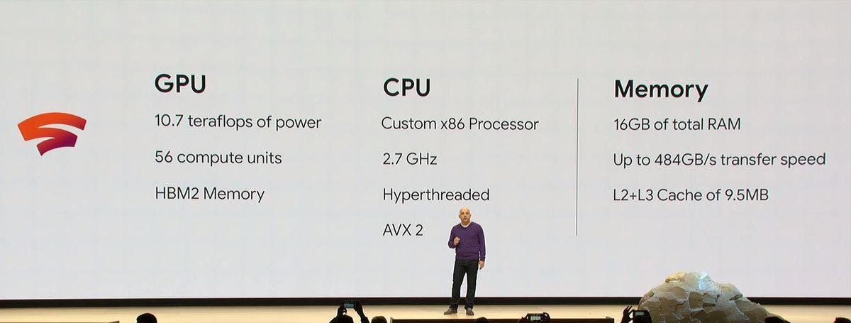 Specs Wat houdt zo’n hardwareset (instantie) precies in? In feite is het een aantal componenten die een eenheid vormen waartoe spelers toegang tot krijgen. Hier en daar is Google wat vaag over de fabrikanten van Stadia’s onderdelen, maar we weten dat een instantie bestaat uit 2,7 GHz CPU, een samengestelde AMD-videokaart met 10,7 teraflops, 16GB RAM-geheugen en Terabytes aan SSD-opslag.