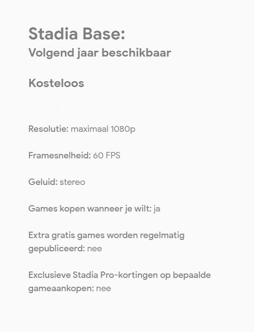 De gratis Base-versie lanceert ergens in 2020. Games dienen dan wel per stuk gekocht te worden. Ook is een Stadia-controller niet per se nodig, je kunt de games ook via bijvoorbeeld een Playstation 4 of Xbox One controller spelen. Games die je via pc afspeelt kunnen met muis en toetsenbord worden bestuurd.