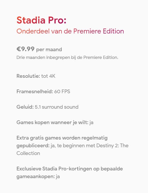 Ook is er Stadia Pro, waar je € 9,99 voor betaalt. Hiermee kan je niet alleen games spelen in 4K en met 60fps, maar zijn sommige games ook gratis te spelen, zoals dat met Xbox Live of PlayStation Plus. Met het Pro-abonnement kun je op 19 november al met Google Stadia aan de slag.