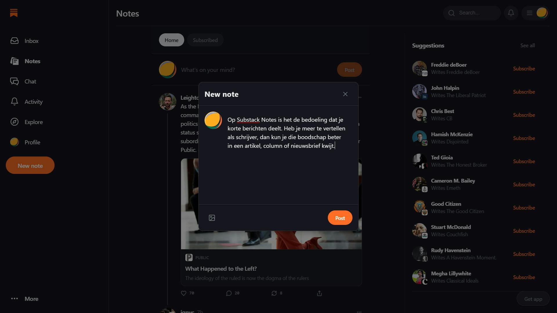 Je kunt ook zelf notes achterlaten op Substack Notes. Je hebt hiervoor een account nodig, dat je met een druk op de knop kunt aanmaken. Binnen de app log je dan in en tik je op het oranje plusicoon. Zit je op de website? Klik dan, bovenaan de feed, op What’s on you mind? om te beginnen met schrijven. Vervolgens schrijf je op waar je aan denkt, voeg je eventueel een afbeelding of link toe, en tik je op de blauwe uploadknop (in de app) of oranje Post-knop (op de site). Al eerder geplaatste notes kun je zelfs aanpassen, zonder tijdslimiet. Dit kan op iOS en het web, maar nog niet op Android.
