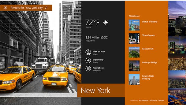 In het oog springend zijn de zoekresultaten, die verschijnen als je in het startscherm je zoekopdracht begint te typen. De resultaten van zoekmachine Bing worden hierin opgenomen en visueel fraai weergegeven. Tenminste ... tijdens de presentatie. De Nederlandse versie van Bing is helaas nog steeds beperkt ten opzichte van de Amerikaanse versie. Ook is het onwaarschijnlijk dat je Google minder gaat gebruiken met deze integratie, omdat de zoekresultaten hier simpelweg niet aan kunnen tippen.