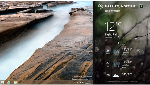 In de nieuwe interface van Windows 8.1 zitten een aantal subtiele, maar handige veranderingen. Als je meerdere apps naast elkaar plaatst, dan kan het formaat eigenhandig aangepast worden. In Windows 8 was er een standaard verdeling van 70% en 30%. Als de resolutie nu hoog genoeg is, kan je zelfs meer dan twee apps naast elkaar plaatsen.
