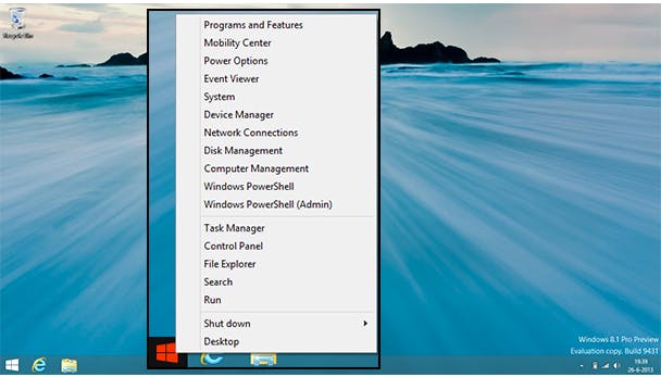 Met de update naar 8.1 is er op het bureaublad weer een startknop te zien. Een opluchting? Deels. De knop oogt vertrouwd, maar geeft geen startmenu. Een druk op de linkermuisknop schakelt (opvallend soepel) naar de nieuwe interface. Een druk op de rechtermuisknop toont wel een uitvouwmenu met enkele opties.