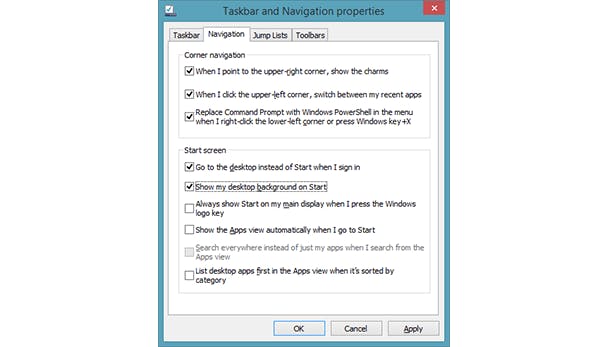 De opties voor de bureaubladachtergrond in het startmenu en het opstarten naar de desktop staan standaard uit en zitten verscholen in het besturingssysteem. Hiervoor moet je de Taskbar and Navigation properties opzoeken (typ de naam in het startmenu in). Onder het tabblad Navigation kan je vervolgens vinkjes plaatsen bij Go to the desktop instead of Start when I sign in en Show my desktop background on Start.