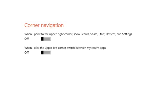 Ook kan je het links-inschuivende applicatieoverzicht en het rechts-inschuivende instellingenmenu zo aanpassen dat deze niet meer inschuiven als je met je muis in de hoek komt. Hiervoor ga je naar PC Settings (je blijft gewoon in het startscherm) en kies je voor PC & Devices / Corners & edges. Onder Corner navigation kan je de schuifjes op Off zetten.
