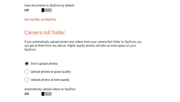 Meer onder de indruk zijn we van de diepere integratie van SkyDrive. Zo kan je instellen dat gemaakte foto's, video's en zelfs documenten standaard op je SkyDrive opgeslagen worden. Dat scheelt bijvoorbeeld bij hardwarefalen: je bestanden zijn veilig online terug te vinden.