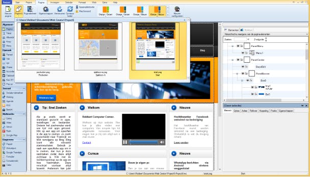 De interface van Web Creator Pro 6 ziet er vertrouwd uit. De ontwikkelaar heeft zoveel mogelijk het standaarduiterlijk van Windows aangehouden. Bovenin vinden we een Lint met verschillende tabbladen, zoals we dat van Microsoft Office kennen. Aan de linkerkant van het programma staat een werkbalk met elementen die aan de website toegevoegd kunnen worden. De rechterkant wordt ingenomen door een werkbalk die de hiërarchie van de webpagina weergeeft en de eigenschappen van het geselecteerde element. Lees ook: Gratis je eigen website bouwen met WordPress.