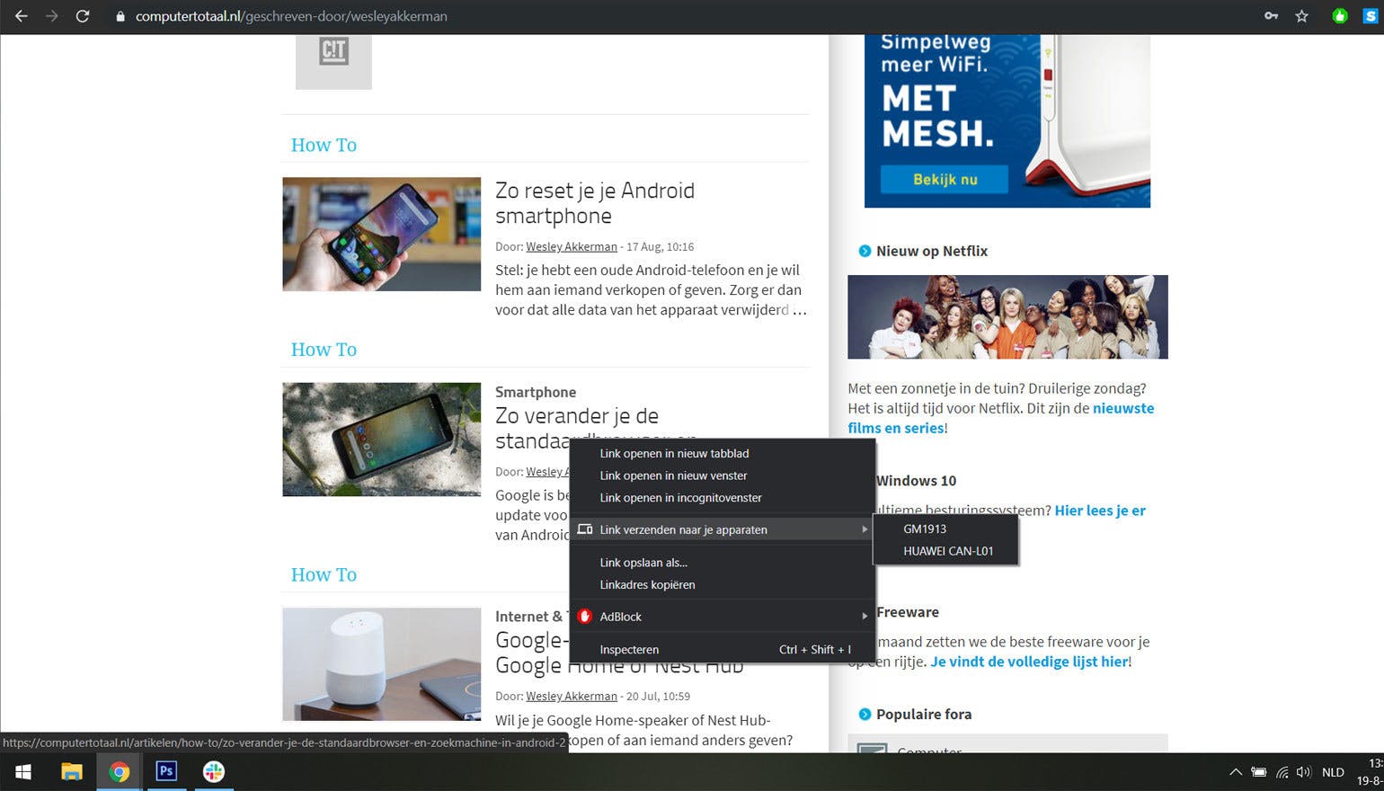 Voordat je kunt beginnen dien je eerst in te loggen bij Google Chrome: op je computer en op je smartphone of tablet. Heb je de app nog niet gedownload? Dan moet je dat natuurlijk eerst even doen. Als je het programma of de app voor het eerst opent, dan kun je meteen inloggen. Ga vervolgens op je computer binnen de Chrome-browser naar een webpagina met daarop een link naar een andere pagina en druk met je rechtermuisknop op die link (als voorbeeld kun je de pagina gebruiken die we hier gelinkt hebben). Nu krijg je enkele opties te zien, zoals het openen van een nieuwe tab, het openen van een nieuwe tab in de incognitomodus of het kunnen opslaan van een link. In dit menu vind je in het vervolg ook een nieuwe functie.