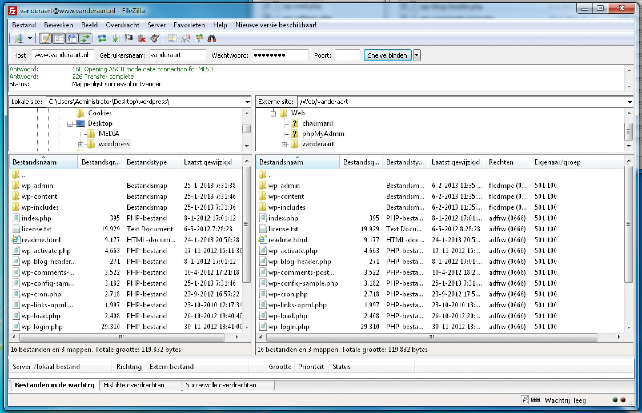 De eerste stap bij het afnemen van een dienst van een hostingprovider is het registreren van een domeinnaam. Die wordt geleverd met het door u gewenste hostingpakket – met in dit geval dus een webserver met php en MySQL. De hostingprovider verstrekt u vervolgens inloggegevens voor de webruimte, waarmee u via ftp uw bestanden kunt uitwisselen (zie afbeelding). Zorg ervoor dat alleen ú toegang hebt tot uw webruimte. Rest het slechts om de inhoud van het eerder opgehaalde en uitgepakte zip-bestand in één keer naar de webruimte over te hevelen. Voor wat betreft de veiligheid is het wachtwoord dat u hier kiest alles bepalend. Dus graag iets dat niet kan worden bedacht, iets met hoofdletters, kleine letters en cijfers…