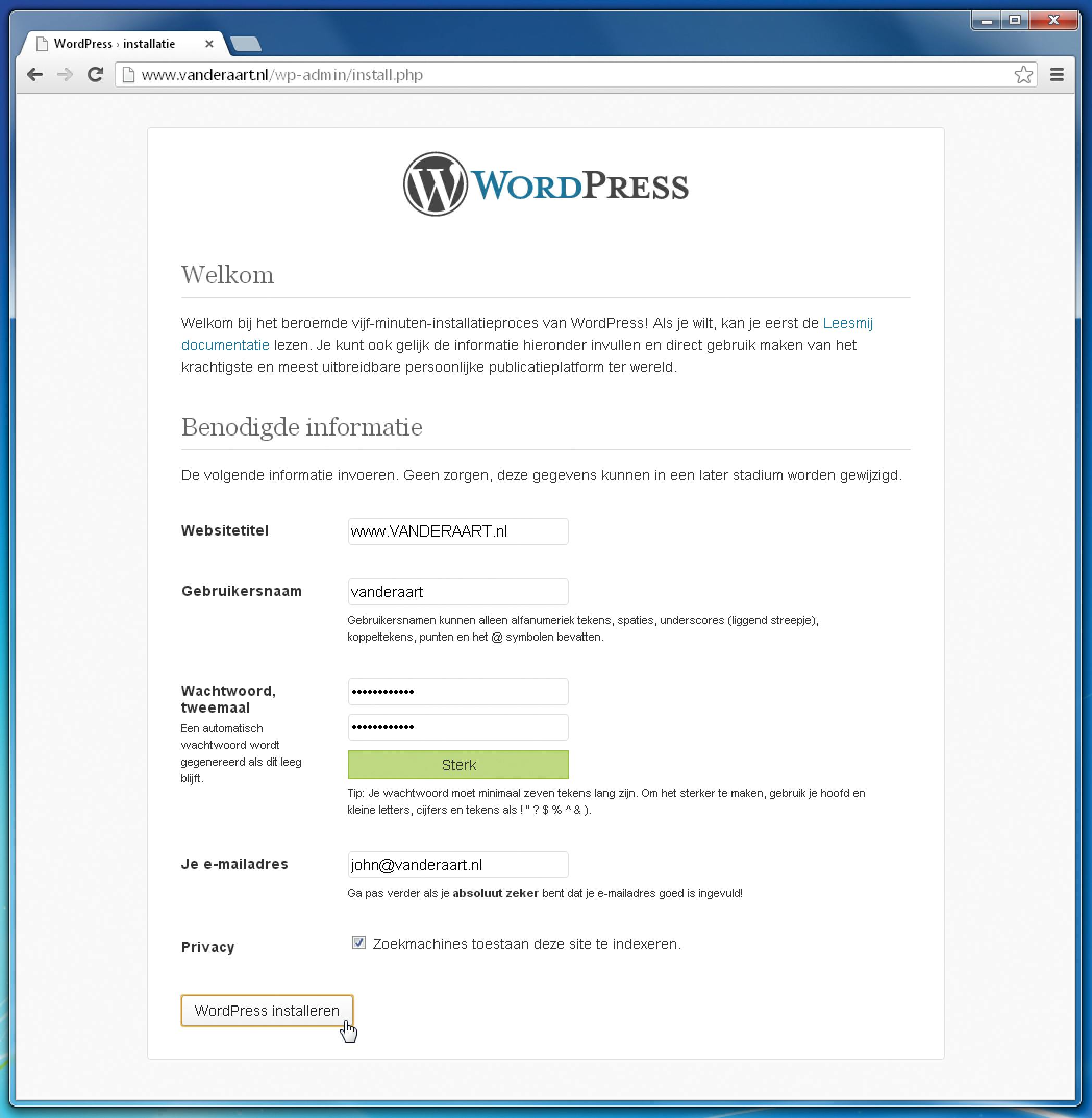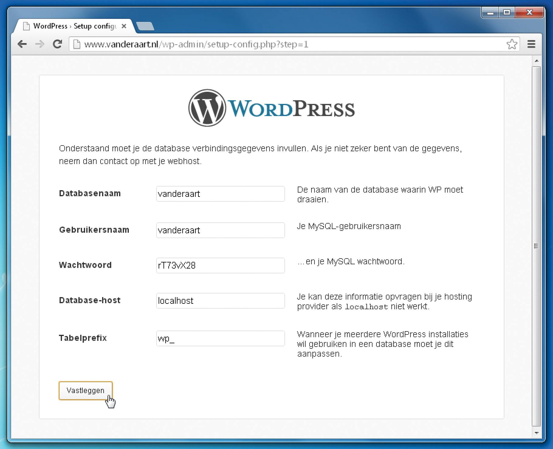 We zijn een aardig eind op weg! Omdat de WordPress-bestanden al op de webserver staan, kunnen we het installatieproces op gang brengen door via de browser onze url te benaderen (in ons voorbeeld dus www.vanderaart.nl). In dit proces wordt de website daadwerkelijk gebouwd! Allereerst wordt er een systeembestand bestand gecreëerd – wp-config.php – met daarin een aantal uitgangspunten die WordPress nodig heeft om te kunnen functioneren. Denkt u in het bijzonder aan de toegang tot de MySQL-database. Ook de taalinstelling – in ons geval ‘nl_NL’ – wordt in wp-config.php verzorgd. U voert hier de toegangsgegevens in die u eerder hebt genoteerd (zie de alinea onder het kopje Database) (zie afbeelding). Als u alles correct hebt ingevuld, kan WordPress nu contact maken met uw MySQL-database en is het eerste deel van de installatie afgerond.
