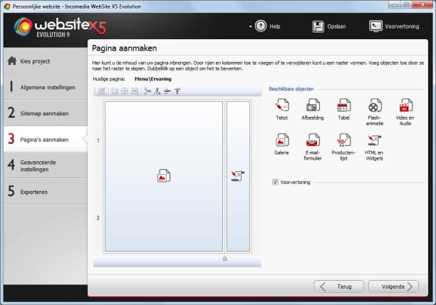 Om op een eenvoudige manier een website in elkaar te knutselen, gebruiken heel wat programma's van de concurrentie een WYSIWYG-editor ('what you see is what you get'). Elk tekstvak, iedere afbeelding of gadget dat u wilt toevoegen aan een pagina, verschijnt meteen op uw scherm. Zo werkt WebSite X5 Evolution 9 niet. Met dit programma ontwerpt u in vijf eenvoudige stappen een website, blog of online winkel. Bekijk allereerst even de