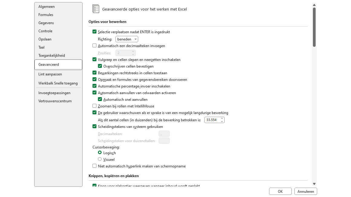 Bewust beperkt Werkt bij jou de optie Snel aanvullen niet? Deze functie moet in Excel wel geactiveerd zijn. Je kunt dit controleren via Bestand / Opties / Geavanceerd. Daar zie je de optie Automatisch aanvullen van celwaarden activeren en Automatisch snel aanvullen. Zorg dat deze twee opties aangevinkt zijn. Klik op OK om de wijziging op te slaan en keer dan terug naar het rekenblad waar je de tekst wilt combineren.