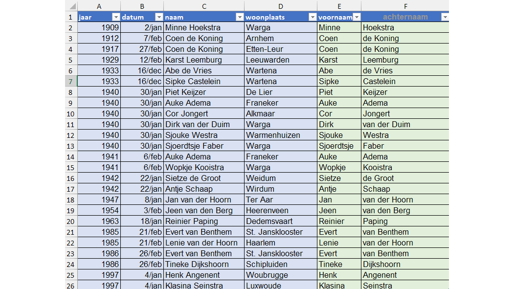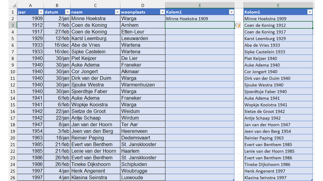 Je vermijdt dit door als referentie een achternaam met tussenvoegsel te gebruiken. In dit geval gebruik je bijvoorbeeld als referentie C3 Coen de Koning. Daarna typ je in de nieuwe kolom bij F3 de volledige achternaam de Koning, je bevestigt met Enter en je gebruikt Ctrl+E. Je zult zien dat Excel hierdoor begrijpt dat er ook achternamen bij staan met tussenvoegsels.