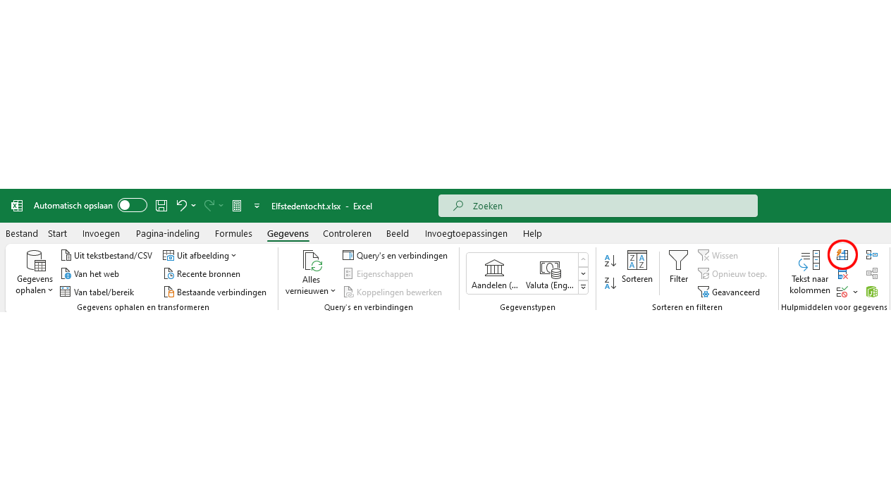 De allereerste oplossing die je absoluut moet kennen, is de functie Snel aanvullen. Deze handigheid is beter bekend onder de toepasselijke Engelse naam Flash Fill. Het komt erop neer dat Excel zelf patronen in de gegevens herkent waardoor jij heel makkelijk kunt vragen om gegevens te verwerken zoals jij het wilt. Het mooie van Snel aanvullen is dat je geen enkele formule hoeft te kennen. Het enige wat je moet weten is dat het knopje naar deze functie in het tabblad Gegevens bij Hulpmiddel voor gegevens staat. Je herkent de knop aan het kleine bliksempje (de flash). Of je gebruikt de sneltoets Ctrl+E.