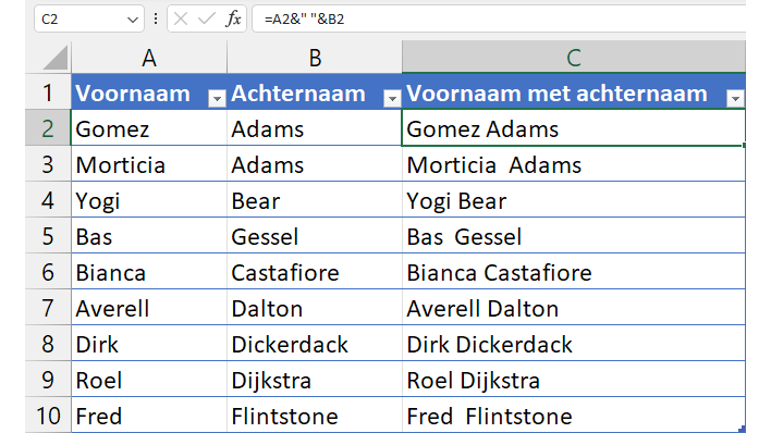 Waarschijnlijk wil je een spatie tussen de voor- en achternamen invoegen. Die spatie plaats je tussen aanhalingstekens en dan wordt de formule =A2&" "&B2. Alles wat je tussen aanhalingstekens plaatst, wordt letterlijk ingevoegd. In mensentaal lees je deze formule als: plaats de inhoud van A2, met daarachter een spatie en daarna de inhoud van cel B2.