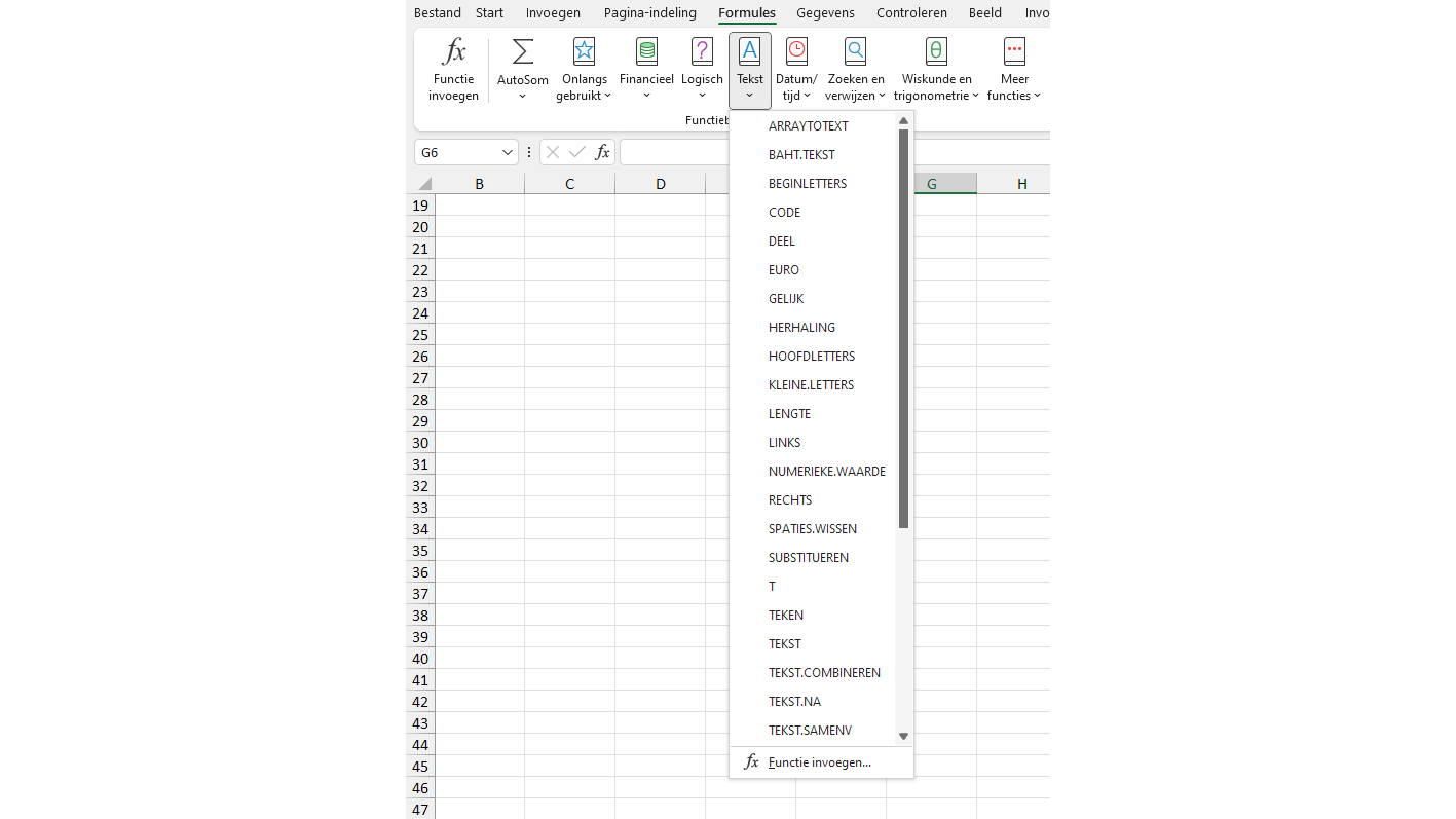 De formule TEKST.COMBINEREN is beschikbaar in de nieuwere versie van Excel waaronder Microsoft 365, Excel voor het web, Excel 2021 en Excel 2019. Een fout in een formule is snel gemaakt. Daarom kun je het best via de categorie Functiebibliotheek werken, dan kun je een wizard gebruiken. Klik in het Lint op het tabblad Formules en kies daar het functieboek Tekst.