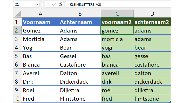Om de achternamen ook te ontdoen van hun hoofdletters gebruik je voor D2 deze formule:
