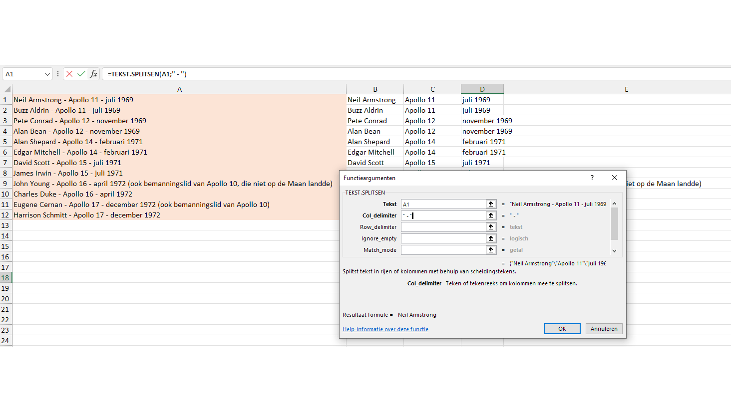 Soms ontvang je een lijst waarbij te veel data in dezelfde kolom bij elkaar zijn gebracht. Zoals hier onze lijst van astronauten die voet op de maan hebben gezet. Als je deze gegevens wilt splitsen over drie kolommen (naam, project en periode), dan kun je dit in een handomdraai fiksen met de formule TEKST.SPLITSEN.