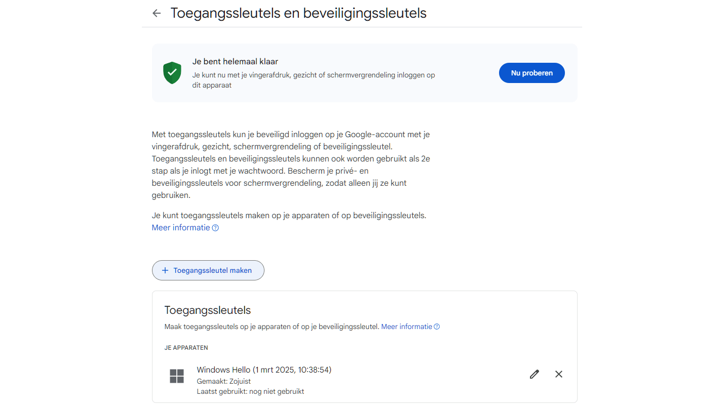 Voor Google bijvoorbeeld ga je naar http://www.google.com/account/about/passkeys en klik je op Beginnen. Meld je aan met je e-mailadres en wachtwoord, klik tweemaal op Toegangssleutel maken en volg de verdere instructies.