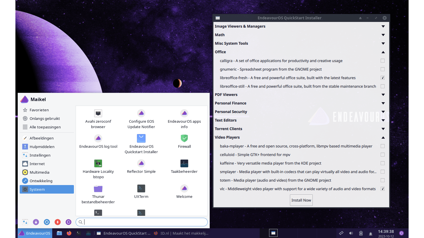 Misschien wil je extra programma’s installeren. Dat is zo gepiept, want je kunt populaire toepassingen vanuit een centrale plek downloaden. Ga in het menu naar Systeem en open de hulpapplicatie EndeavourOS Quickstart Installer. Klik op een categorie om de onderliggende programma’s te tonen. Kies je bijvoorbeeld Office, dan kun je het gratis kantoorpakket LibreOffice installeren.
