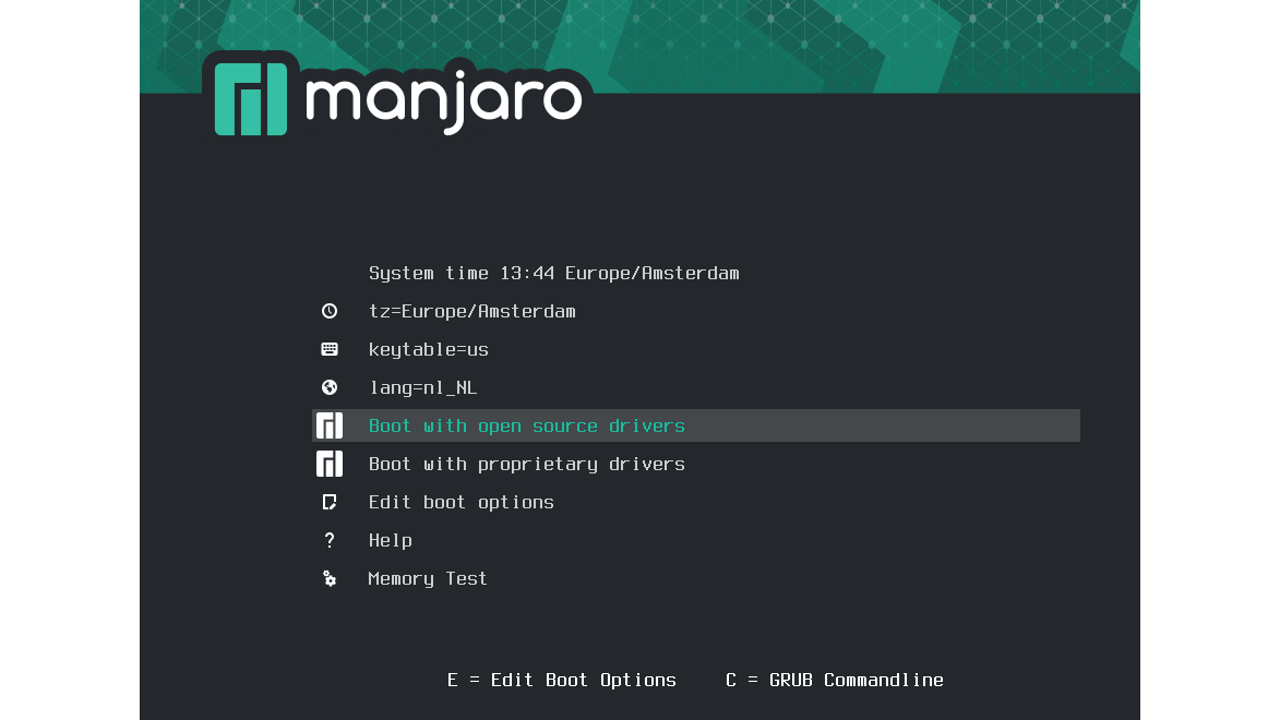 Net als eerder bij EndeavourOS heb je voor de installatie van Manjaro eveneens een installatiestick nodig. De handleiding verwijst hiervoor onder andere naar het hulpprogramma Rufus. Lees voor de exacte instructies zo nodig de paragrafen ‘Usb-stick prepareren’ en ‘Opstarten vanaf usb-stick’ nog eens terug. Gebruik hierbij het zojuist gedownloade iso-image van Manjaro. Na even wachten verschijnt er een menu. Je stelt met de pijltjestoetsen respectievelijk de juiste tijdzone, toetsenbordindeling en taal in. Klik als laatste op Boot with open source drivers om de liveomgeving te openen.