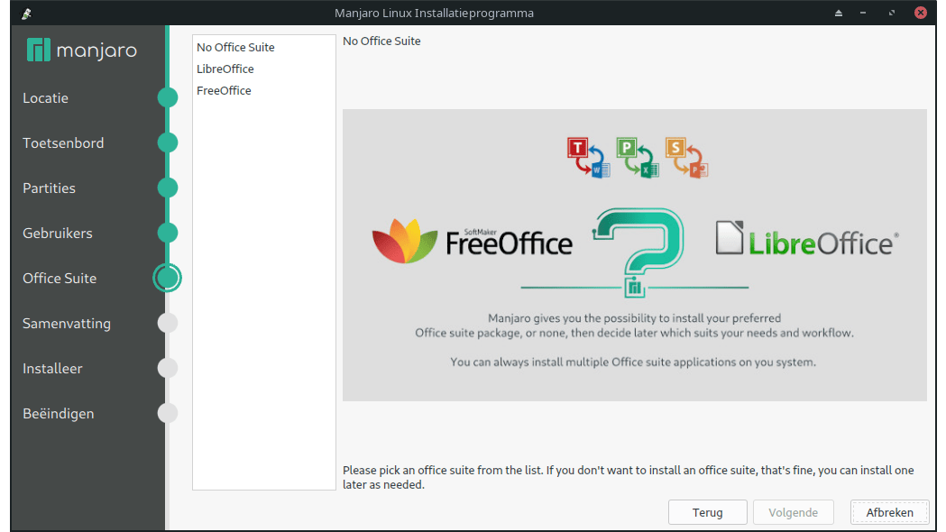 Handig is dat je in het installatieprogramma alvast een kantoorpakket kunt selecteren. Kies hierbij tussen FreeOffice en LibreOffice. Maak een keuze en bevestig in het volgende venster met Installeer / Nu installeren. Je zet aan het einde een vinkje voor Nu herstarten en sluit af met Voltooid.