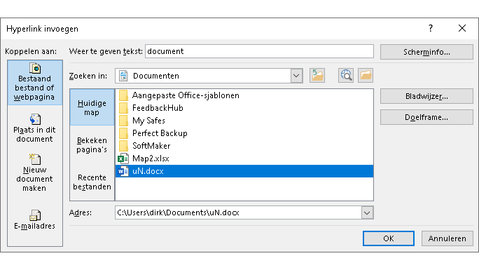 Selecteer de woorden waaraan je de link wilt toevoegen en kies in het tabblad Invoegen de knop Koppelingen. In het dialoogvenster Hyperlink invoegen kun je dan kiezen uit een Bestaand bestand of een webpagina, Plaats in dit document, Nieuw document maken of E-mail-adres. Ga je voor de eerste optie, dan selecteer je in het vak Adres de locatie van het bestand, of je plakt het internetadres van de webpagina. Klik op OK om de wijzigingen op te slaan. In plaats van het tabblad Invoegen kun je met de rechtermuisknop ook de opdracht Koppeling gebruiken of de sneltoets Ctrl+K.