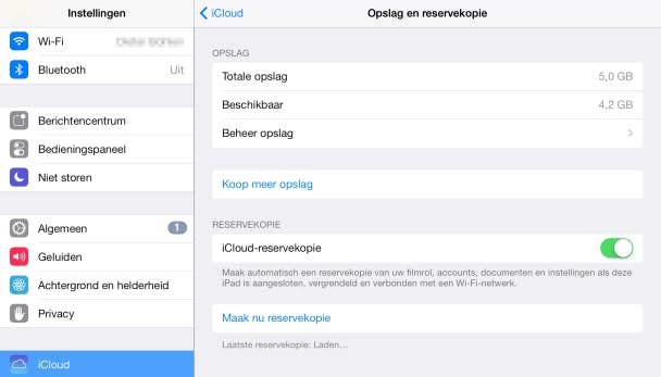De dienst iCloud gaat iets verder en kan een complete reservekopie van je iPhone of iPad maken. Je hebt hiervoor 5 gigabyte tot je beschikking, maar deze ruimte is niet alleen gereserveerd voor reservekopieën. iCloud biedt de reservekopie-optie alleen aan voor mobiele apparaten van Apple. Op een iPhone of iPad ga je naar Instellingen / iCloud / Opslag en reservekopie. Zet de schuif achter iCloud-reservekopie aan en het apparaat zet automatisch kopieën van je foto's, account-instellingen en documenten in de cloud als het apparaat verbinding maakt met een wifi-netwerk.
