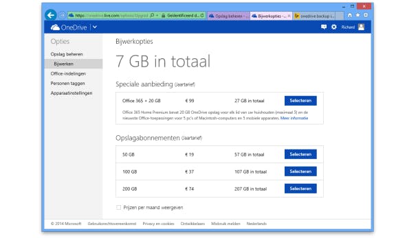 OneDrive biedt 7 gigabyte gratis aan en is goedkoop met upgrades: voor 19 euro per jaar heb je 50 gigabyte. Als je iemand anders uitnodigt om OneDrive te gebruiken, krijg je bovendien 5 gigabyte extra ruimte.