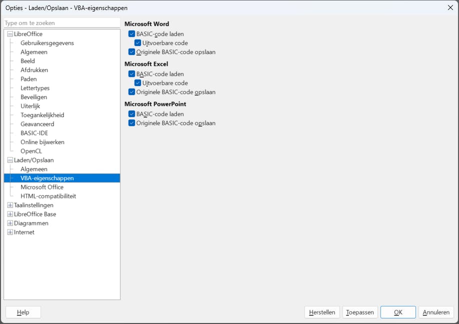 Bij het openen van Microsoft-bestanden geldt: hoe complexer het bestand, met ingebedde objecten, speciale lettertypes of macro’s, hoe groter de kans op incompatibiliteiten. VBA-macro’s werken meestal niet (tenzij je ze handmatig omzet naar LibreOffice Basic of Python). Je kunt compatibiliteit wel verbeteren door enkele opties in te schakelen. Controleer dit via Extra / Opties, ga naar Laden/Opslaan / VBA-eigenschappen en naar Microsoft Office en vink alle opties aan.