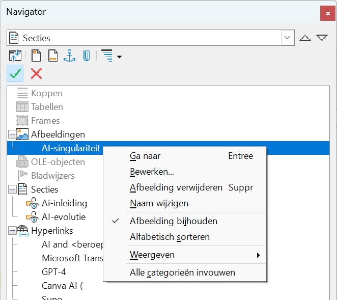 Werk je aan een langer document met meerdere hoofdstukken of veel objecten, zoals afbeeldingen, tabellen en opmerkingen, dan is de Navigator een grote hulp. Je vindt deze in Writer via Beeld / Navigator of met de sneltoets F5. De Navigator geeft een overzicht van de documentstructuur, met onder meer hoofdstuktitels, mits je Kop-stijlen gebruikt, maar ook tabellen, afbeeldingen, links en bladwijzers. Via het contextmenu geef je een geselecteerd item een eigen naam en met één klik ga je meteen naar de juiste plek in het document. Extra handig is dat je de structuur opnieuw ordent door koppen in de Navigator te verslepen, waarbij de bijbehorende tekst automatisch mee verhuist. Hiervoor zijn bovenaan de Navigator ook specifieke knoppen beschikbaar.