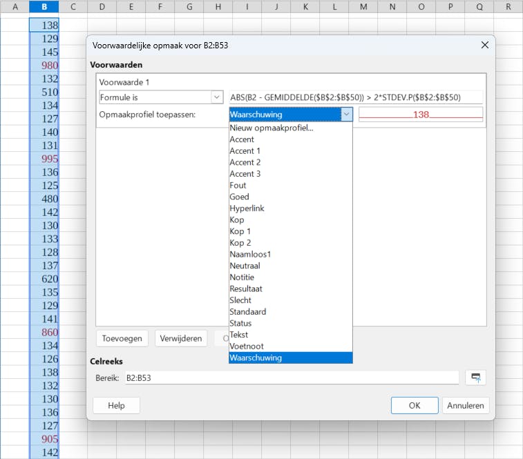 Stel, je wilt automatisch afwijkende waarden in een lijst opsporen: zet de waarden dan in één kolom, bijvoorbeeld B2 tot B50, en selecteer dit bereik. Ga naar Opmaak / Voorwaardelijk / Voorwaarde / Meer regels. Kies bij Voorwaarde 1 de optie Formule is en vul in het lege veld bijvoorbeeld de volgende statistische formule in: