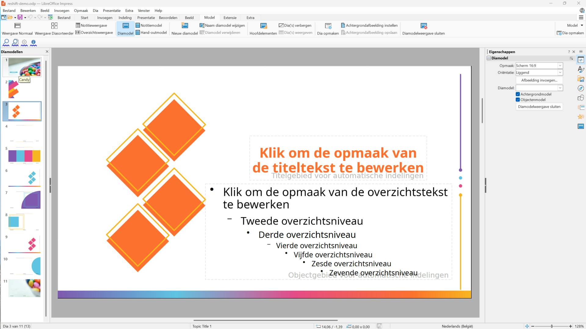 We gaan ervan uit dat je al een diapresentatie hebt gemaakt of geopend in Impress en nu aanpassingen wilt doen, zoals het wijzigen van het lettertype, de achtergrondkleur of het toevoegen van objecten zoals een afbeelding.