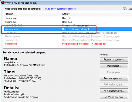 What’s my computer doing helpt ook bij het handmatig opsporen en verwijderen van virussen en spyware. Met de knop Terminatie proces kunt u een programma uit het geheugen verwijderen. De knoppen Virustotal.com en Kaspersky.com verwijzen naar online diensten waar u een bepaald programma kunt laten inspecteren op mogelijke kwaadwillende inhoud.