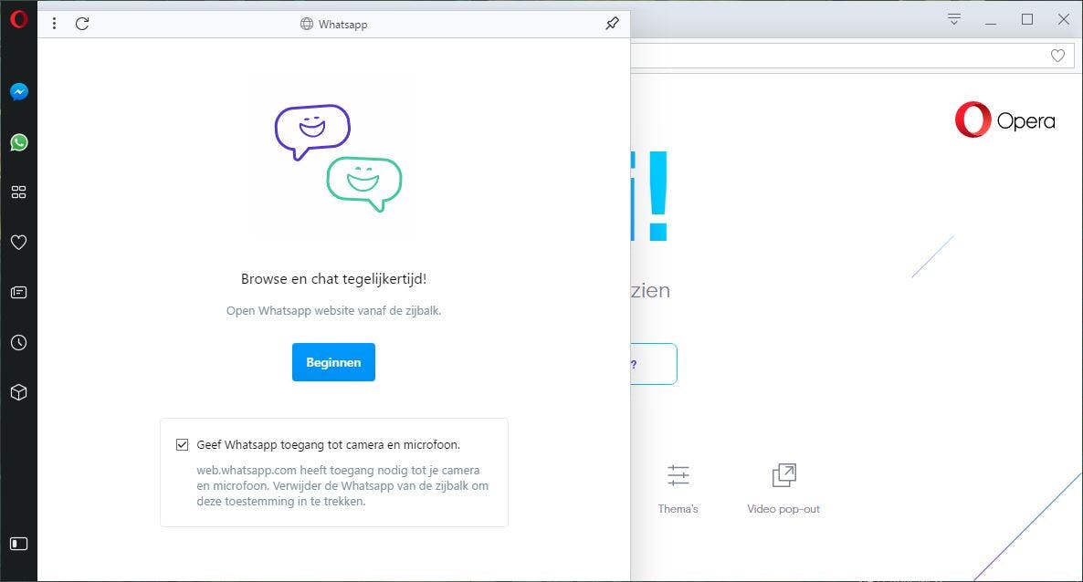 Facebook Messenger werkt eigenlijk nog eenvoudiger in Opera. Klik op het Messenger-icoontje, vervolgens op Beginnen. Nu log je in met je Facebook-gegevens, en chatten maar.