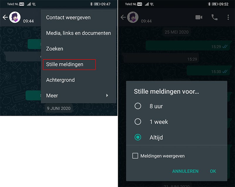 Zorg ervoor dat er géén vinkje staat voor Meldingen weergeven. Doe je dit wel, dan krijg je nog steeds notificaties. Het enige verschil is dan dat ze geen geluid meer maken. Wil je naderhand wel weer meldingen ontvangen, tik dan opnieuw op de bolletjes en kies Meldingen dempen opheffen.