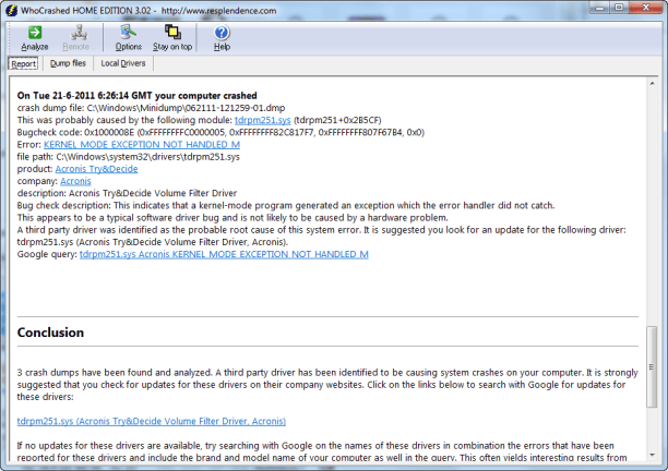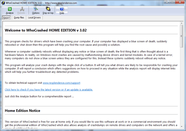 Toegegeven, WhoCrashed is een 'one trick pony': het kan verdraaid weinig. Maar wanneer u een crash hebt of een computer die maar blijft herstarten (u kunt WhoCrashed dan in veilige modus starten), dan is dit programma goud waard. Starten, scan draaien, en een paar seconden later weet u met welke software of welk hardwarecomponent u een hartig woordje moet spreken.