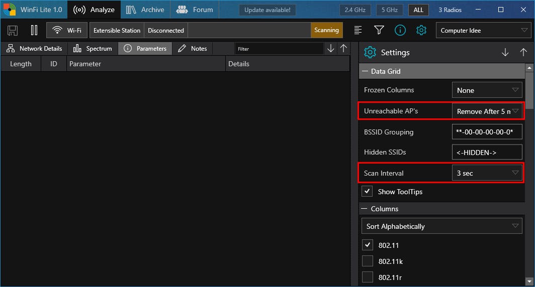 Standaard scant WinFi Lite om de drie seconden naar draadloze netwerken. Om dit scanproces te pauzeren, druk je linksboven op de Pause-knop. Nogmaals drukken en het scanproces gaat weer verder. Je kunt de scanfrequentie overigens ook aanpassen. Klik op Settings, open de rubriek Data Grid en kies een geschikte frequentie bij Scan Interval (van 0 tot 10 seconden). Merk op dat Unreachable AP’s hier standaard staat ingesteld op Remove After 3 min. Dat houdt in dat netwerken die daarnet wel (nog) actief of detecteerbaar waren, na drie minuten niet langer zichtbaar zijn. Je kunt deze optie echter ook instellen op Don’t show of de onbereikbare netwerken pas na 15 minuten niet langer laten weergeven.