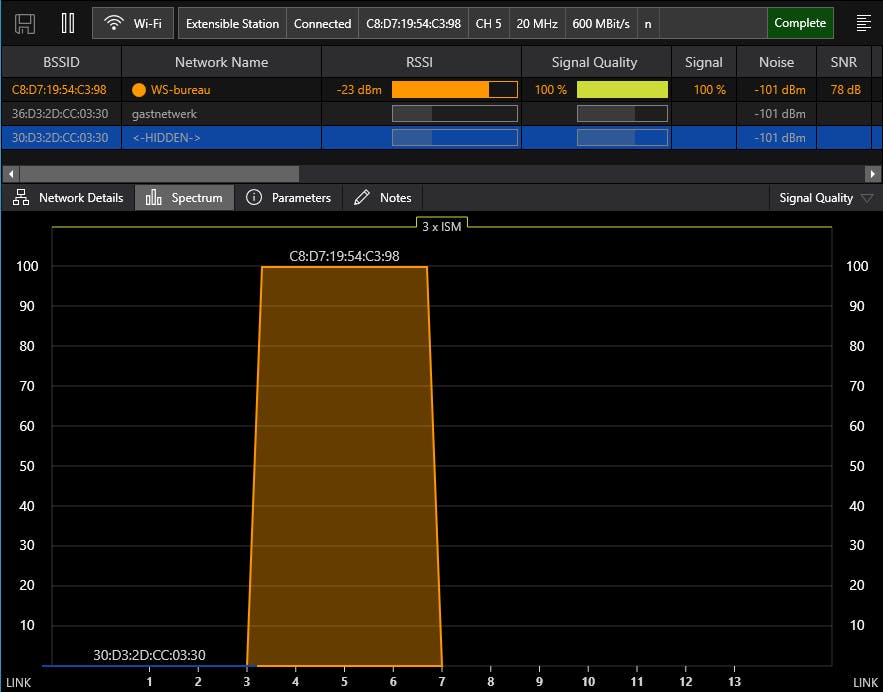 De kolom SNR (signal to noise ratio) is nauw verwant aan de RSSI-data. Hoe hoger de snr-waarde, uitgedrukt in decibels (dB), hoe sterker het wifi-signaal uitkomt boven eventuele achtergrondruis. Valt het percentage lager uit dan circa 25 dB, dan hoef je niet veel te verwachten van het wifi-signaal.