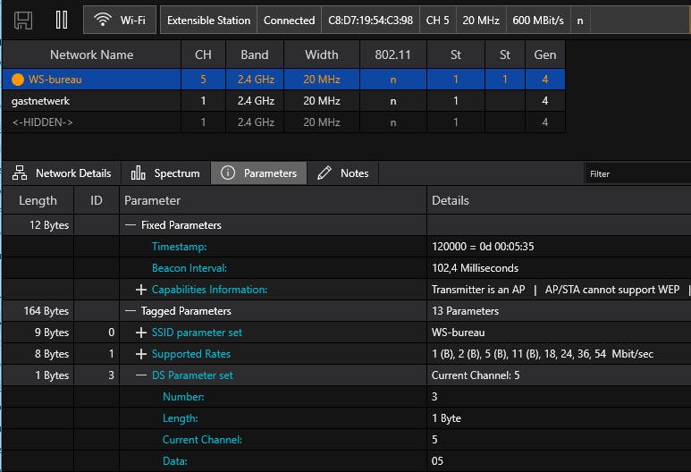 Heb je verschillende draadloze toegangspunten met dezelfde netwerknaam, dan verschijnt die Network Name oftewel ssid (service set identifier) normaliter ook meerdere keren in WinFi Lite. Om uit te zoeken welk item bij welk toegangspunt hoort, kun je de kolom BSSID zichtbaar maken. Dat staat voor ‘basic service set identifier’ en is weinig meer dan het mac-adres dat voor elke netwerkadapter van het toegangspunt uniek is.
