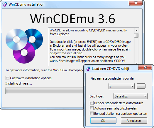 WinCDEmu koppelt een schijfletter in Start / Computer aan het iso-bestand. Dit koppelen wordt mounten genoemd. Na de installatie kunt u dubbelklikken op een iso-bestand. WinCDEmu vraagt welke schijfletter u hieraan wilt koppelen, kies bijvoorbeeld V. Bevestig met OK en de inhoud van het iso-bestand verschijnt tussen uw lijst opslagapparatuur in Start / Computer. Na een herstart van de computer wordt het iso-bestand automatisch ontkoppeld, vergelijkbaar met het verwijderen van een cd of dvd uit het laatje. U kunt dit ook handmatig doen. Klik rechts op de schijfletter en kies Uitwerpen om het iso-bestand te ontkoppelen (unmounten). Tijdens de installatie van WinCDEmu kan Windows een waarschuwing geven omdat een stuurprogramma niet juist ondertekend is. De oorzaak ligt bij de virtuele cd/dvd-speler die geïnstalleerd wordt door WinCDEmu. Niets om u zorgen over te maken, het kan geen kwaad. Mocht u hierbij toch uw bedenkingen hebben, dan kunt u de installatie afbreken.