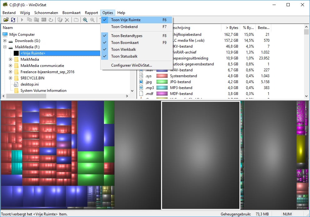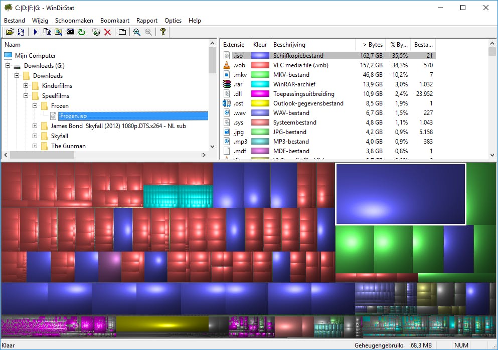 In feite is WinDirStat niets meer dan een eenvoudig analyseprogramma voor Windows. Bijzonder is dat dit tooltje analyses zeer snel uitvoert. Je weet hierdoor meteen hoeveel GB’s aan muziek, films en systeembestanden er op de pc staan opgeslagen. Aan de hand hiervan ontdek je wellicht ruimtevreters die onnodig veel opslagcapaciteit opeisen.