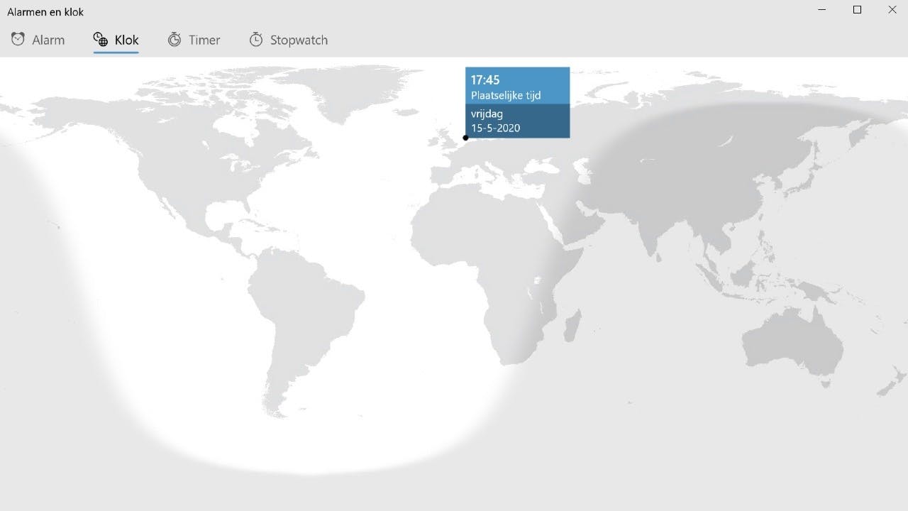 Om een toegevoegd alarm uit de lijst te verwijderen, klik je erop. Je belandt dan weer in het paneel waarin het alarm geconfigureerd kan worden. Klik op het vuilnisbakje rechtsonder in het venster en je alarm is na bevestigen verwijderd. Zoals beloofd bevat de app Alarmen en klok meer leuks. Onder Klok (knoppenbalk bovenin het venster) vindt je een grafische wereldklok. Onder Timer is een afteltimer in te stellen, bijvoorbeeld om telkens weer dat perfect gekookte ei te realiseren. En mocht je willen weten hoe lang het duurt voor de batterij van je elektrische puntenslijper leeg is bij continu gebruik, dan komt de Stopwatch perfect van pas.