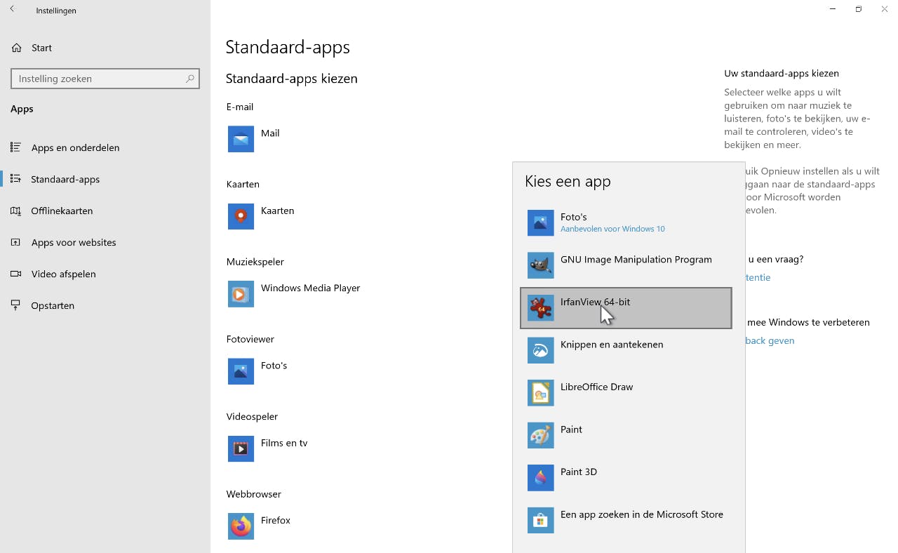 Klik in het menu Start op Instellingen en dan in het geopende venster op Apps. Klik vervolgens in de kolom links op Standaard-apps. Zoals gezegd willen we in dit voorbeeld alle grafische bestanden door het inmiddels geïnstalleerde IrfanView laten openen na een dubbelklik in de Verkenner. Om dat te realiseren, klik je rechts op Foto’s, onder het kopje Fotoviewer. In het selectiemenu Kies een app klik je vervolgens op IrfanView (of een andere viewer die je graag zou gebruiken). Wacht een paar seconden en voortaan wordt elke dubbelklik op een foto-bestand beloond met het openen daarvan in IrfanView.