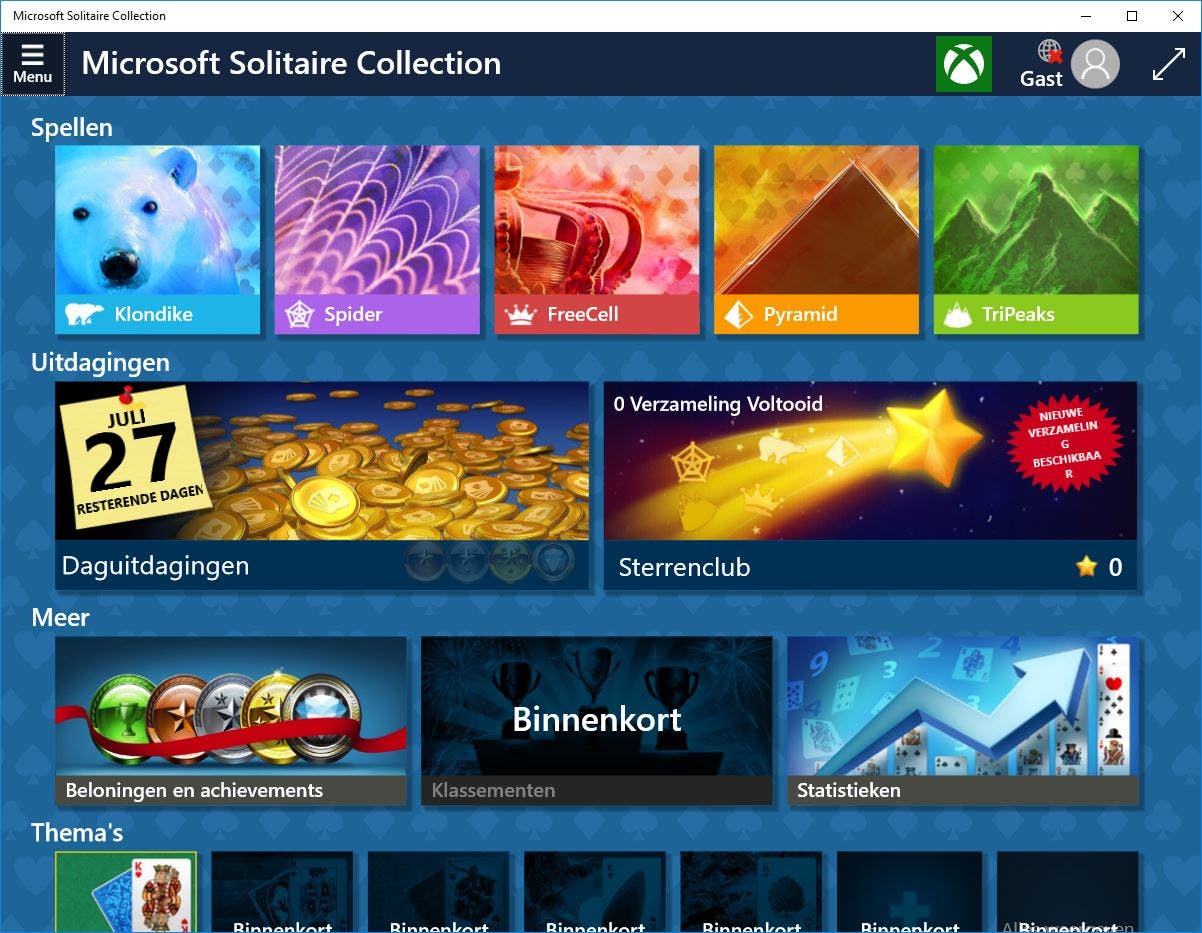 De klassieke Windows-spelletjes vind je nu in het startmenu onder Alle Apps. Scroll omlaag naar de M om uit te komen bij de Microsoft Solitaire Collection. Inloggen kan met een Microsoft-account, maar is niet noodzakelijk. Voordeel is daarmee dat je voortgang wordt opgeslagen in de cloud. Als je daar geen behoefte aan hebt, kies je er gewoon voor om als gast te spelen.