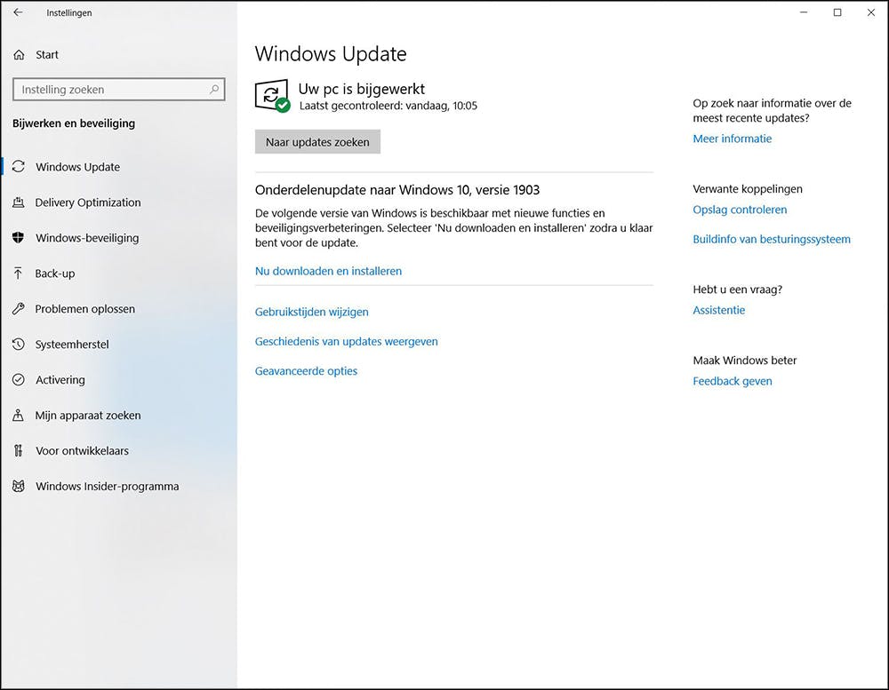 Wil je zo snel mogelijk up-to-date zijn? Ga dan naar Instellingen, Bijwerkingen en beveiliging, Windows Update en klik op Naar updates zoeken. Het is van belang dat je de voorgaande updates reeds hebt geïnstalleerd, anders worden die eerst gedownload. Uiteindelijk krijg je de melding 'Onderdelenupdate naar Windows 10, versie 1903'. Kies dan voor Nu downloaden en installeren.
